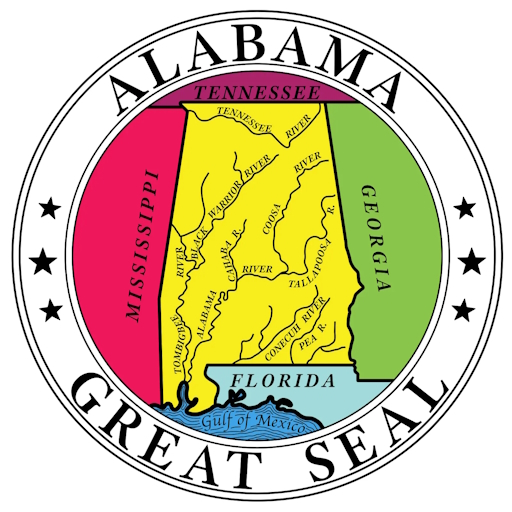 Герб штата включает щит с изображениями флагов Испании, Франции, Великобритании и Конфедеративных Штатов Америки, а также орла в верхней части. В центре щита — река Алабама.