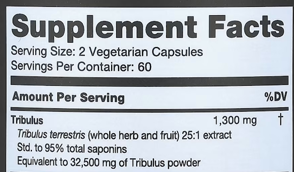 Для получения заметного эффекта в спортивных целях трибулус терестрис обычно должен содержать не менее 60–90%, как на примере выше (в отличии от менее качественных добавок, где 40–45%), причем наиболее активным компонентом считается протодиосцин. Если ориентироваться именно на протодиосцин, то эффективная добавка содержит не менее 10–20% этого вещества от общей массы экстракта. При более низком содержании активных веществ эффект на уровень тестостерона и физическую работоспособность будет слабо выражен или вовсе отсутствовать.