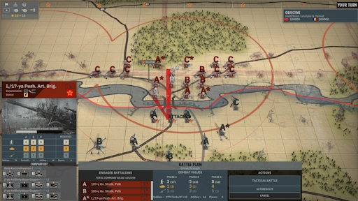 На оперативной карте игроки управляют войсками, учитывая снабжение и погодные условия. В битвах, таких как наступление под Харьковом, можно командовать десятками юнитов, включая танки и артиллерию, с учетом баллистики и морали. Игра предлагает кампании за обе стороны конфликта, с акцентом на историческую точность.