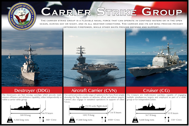 Ядром любой авианосной ударной группы США является атомный авианосец, такой как USS Nimitz (CVN-68), USS Abraham Lincoln (CVN-72) или новейший USS Gerald R. Ford (CVN-78), который может нести на борту до 90 летательных аппаратов различного назначения.