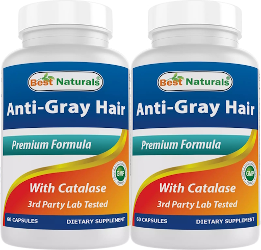 В качестве примера рассмотрим состав веществ, что содержатся в пищевой добавке от фирмы Best Naturals под названием “Anti-Gray Hair”. Стоит она не дорого, средняя цена около $10 за 60 капсул (на 30 дней из расчета 2 капсулы в сутки). Ранее мы рассказывали про фирму Best Naturals, что это очень известная фирма на территории США, имеющая сертификацию GMP, и что она выделяется довольно приемлемыми ценами. Кроме GMP, этот продукт был проверен сторонними лабораториями, о чем гласит надпись на упаковке.