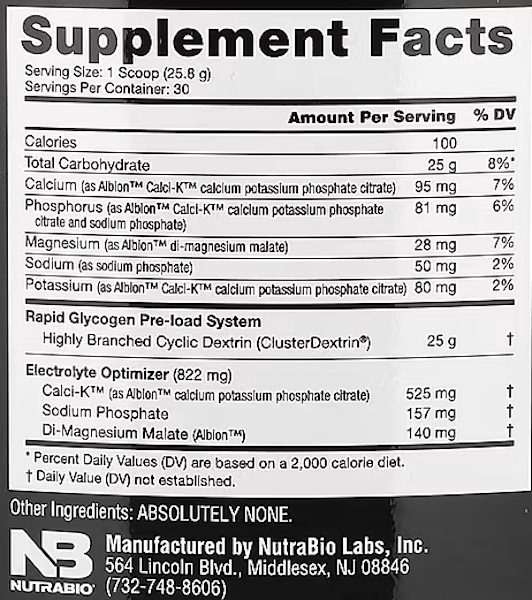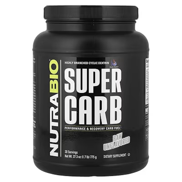 This loader, NutraBio Super Carb, is built around cluster dextrin — a high-molecular-weight carbohydrate with a unique structure that allows it to pass through the stomach almost without delay and be absorbed in the small intestine with minimal osmotic effect.