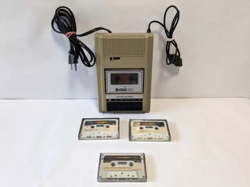 Atari 8-битные компьютеры, такие как Atari 400 и Atari 800, выпущенные в 1979 году, также поддерживали загрузку программ с аудиокассет через устройство Atari 410 Program Recorder. Эти компьютеры изначально проектировались с поддержкой картриджей, но кассеты стали популярным и более дешёвым способом распространения софта, особенно для домашних пользователей. Данные на кассетах записывались в формате 600 бит/с, используя одну дорожку для данных, а вторую для аудио, что позволяло воспроизводить музыку или инструкции во время загрузки.