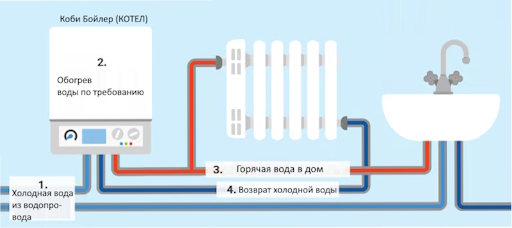 Комби-котел функционирует в двух основных режимах: отопление и горячее водоснабжение.