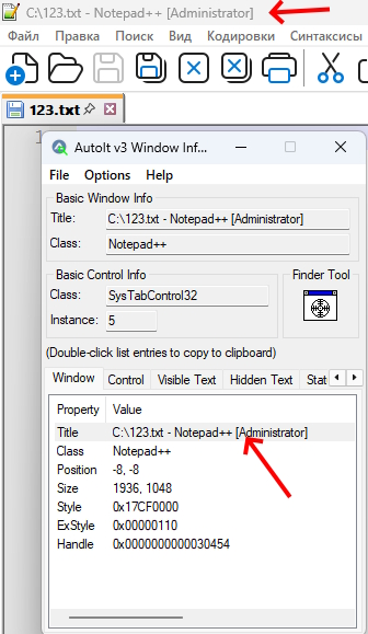 Открой свой файл, запусти утилиту AutoIt Window Info, наведи курсор на окно и посмотри в поле Title — там будет точное название, которое и нужно копировать и вставлять (первая вкладка Window):