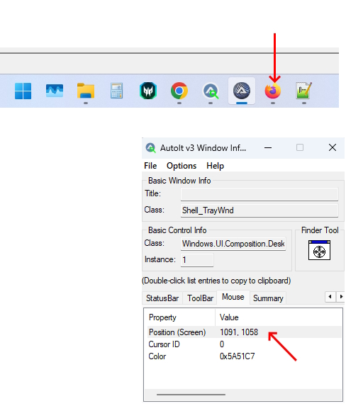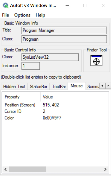 AutoIt Window Info — это утилита, которая идёт вместе с AutoIt и помогает определять точные координаты элементов окна на экране. Чтобы узнать координаты мыши, откройте утилиту, найдите вкладку Mouse (пролистайте вправо), перетащите курсор (Finder Tool) на нужный элемент, и в окне программы появятся значения X и Y (обозначено как Position). Эти координаты можно использовать в командах MouseMove и MouseClick для точного взаимодействия с интерфейсом, особенно если разрешение экрана отличается от других компьютеров.