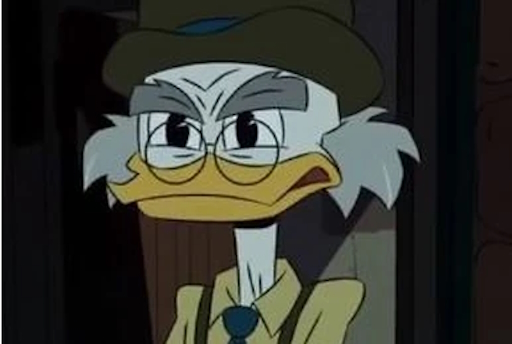 - Внешность: Седая утка в красном жилете и черном цилиндре, символизирующая старинный стиль.