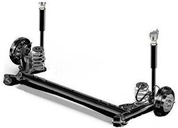 В основе лежит торсионная балка: она скручивается при разнице высот колёс, обеспечивая частичную независимость, но сохраняет жёсткость для стабильности. Дифференциал размещён в корпусе балки, а пружины отделены от амортизаторов для лучшей кинематики. Такая система распространена в бюджетных седанах и хэтчбеках.