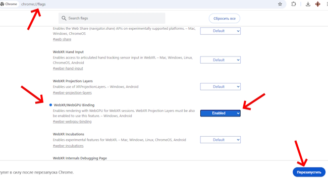 На Windows необходимо, чтобы устройство поддерживало Direct3D 12. Это означает, что графический процессор (GPU) должен быть совместим с DirectX 12, что выполняется для большинства видеокарт NVIDIA (начиная с серии 900, 2014 год), AMD (серия RX 400 и новее, 2016 год) и Intel (встроенная графика Iris Xe или дискретные Arc, начиная с 2020 года). Процессоры и встроенная графика старше 2015 года могут не поддерживать WebGPU из-за отсутствия драйверов Direct3D 12.