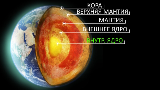 На глубине примерно 5150 км под поверхностью планеты находится твердое ядро, состоящее из железа и никеля, с радиусом около 1300 км. Оно окружено жидким внешним ядром, которое, в свою очередь, заключено в мантию — слой толщиной от 30 до 2900 км под земной корой.